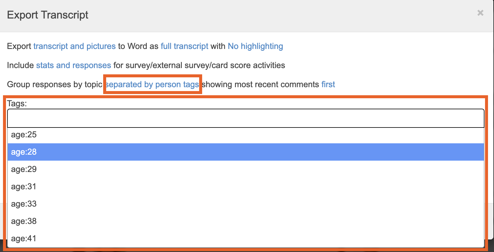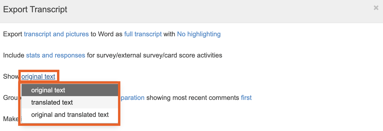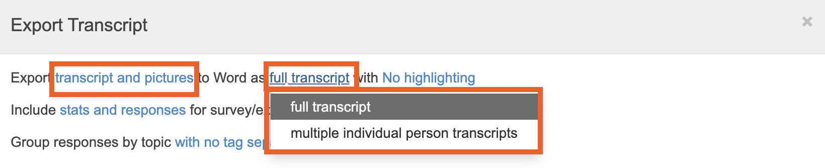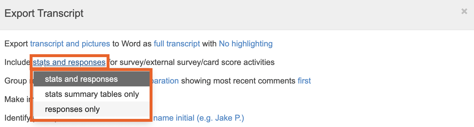 The first setting is to choose if you want to export the transcript only, or also include pictures from activity in the export. You can also decide if you want a full transcript, or multiple individual person transcripts (this will create separate documents for participant).