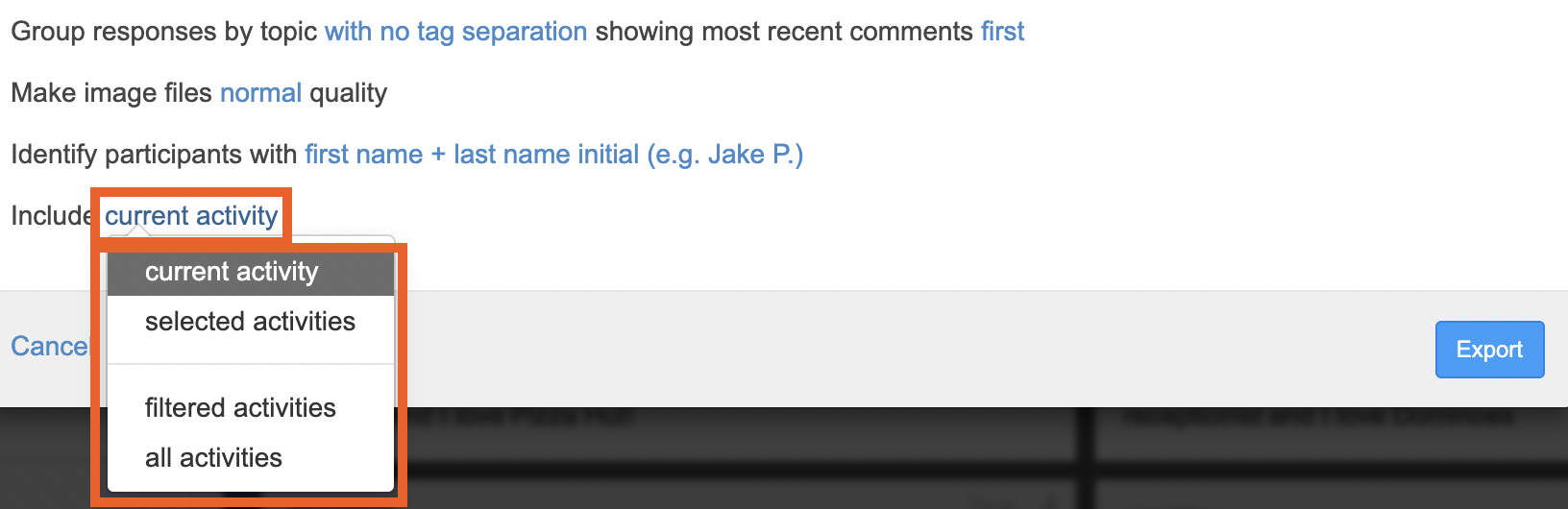 You can choose to include posts from the current activity, all activities or selected activities in your transcript. This should help further streamline your transcript so you are only exporting the data you need.