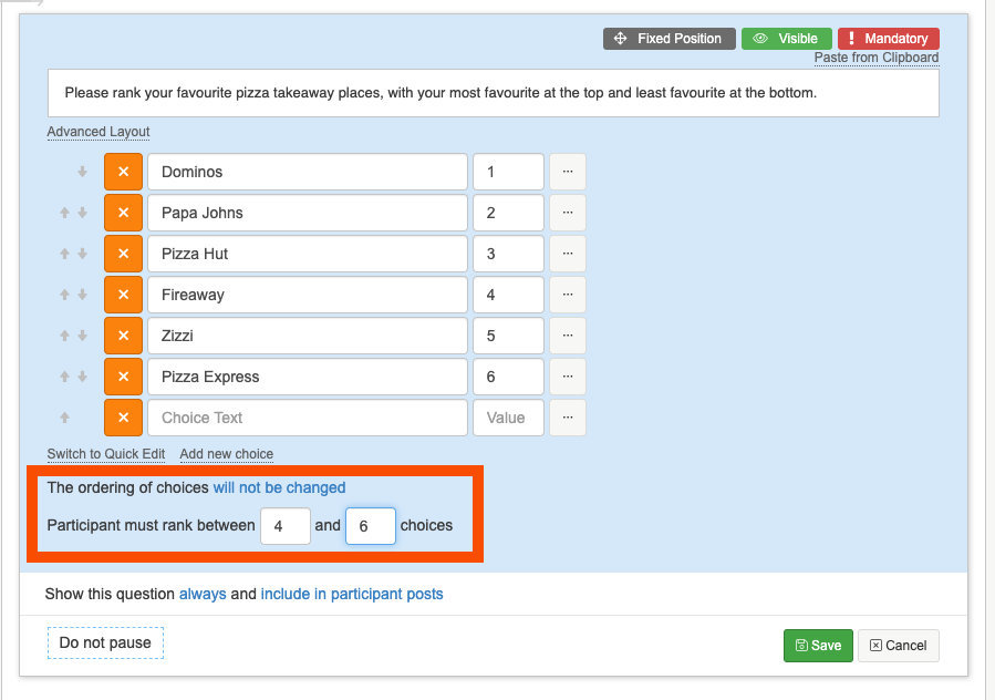 4. Decide if you would like the ordering of choice to remain the same or be randomised, and how many choices participants must rank.