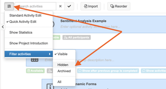 NOTE: Setting an activity to be unavailable, will also hide the activity from the activity edit page. To reinstate the activity, click on the settings icon on the top left of the page, navigate to filter activities and choose hidden.