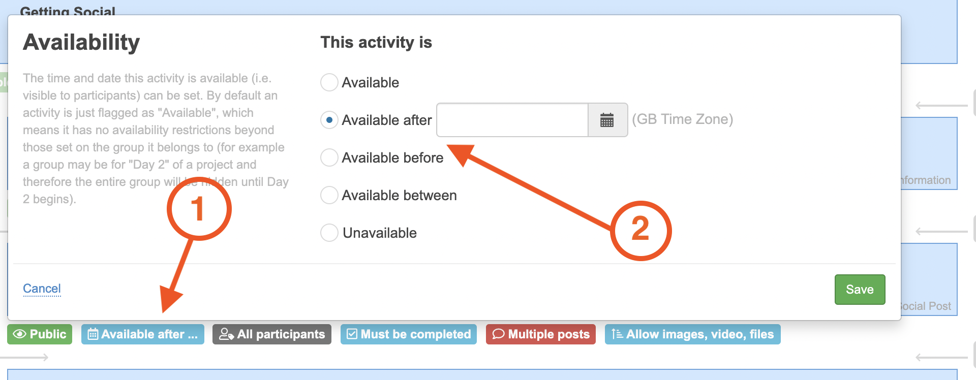 The time and date this activity is available (i.e. visible to participants) can be set. By default an activity is just flagged as "Available", which means it has no availability restrictions beyond those set on the group it belongs to (for example a group may be for "Day 2" of a project and therefore the entire group will be hidden until Day 2 begins).