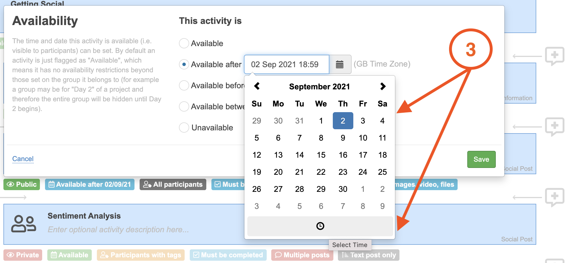 3. Use our calendar function to choose which date and time you would like the activity to be available for.