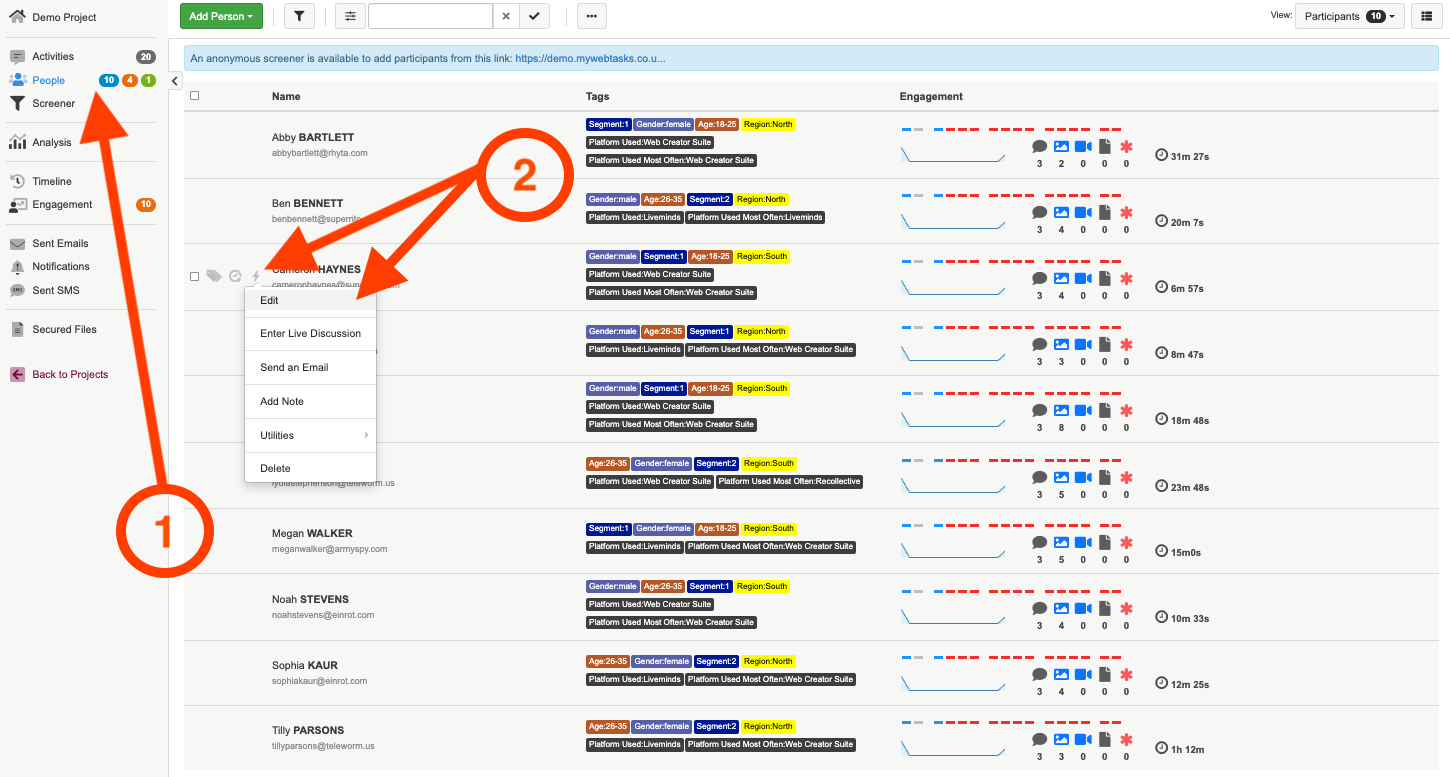 6. You can also change the status of the participant, for example if you wanted to change a person from observer to moderator so they could access analysis you can do so here.