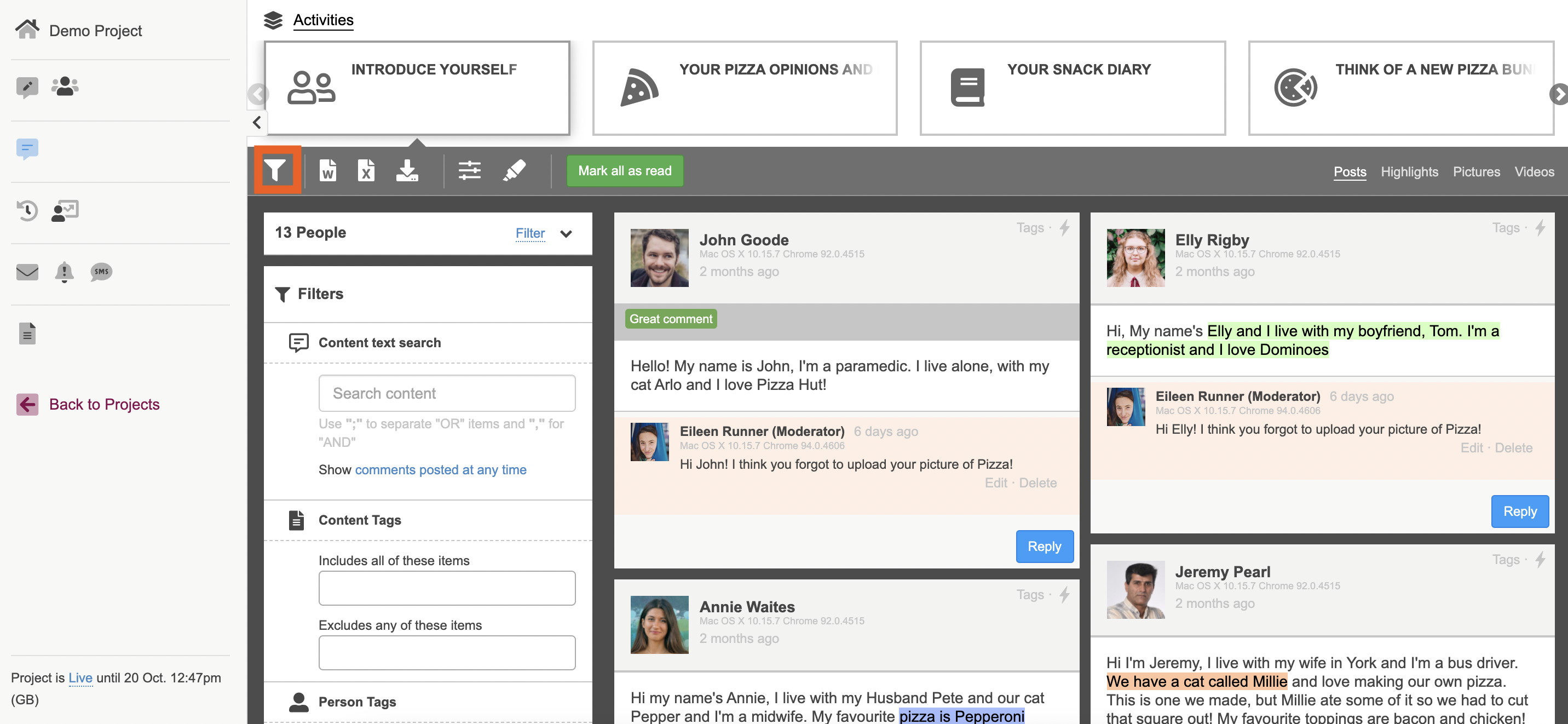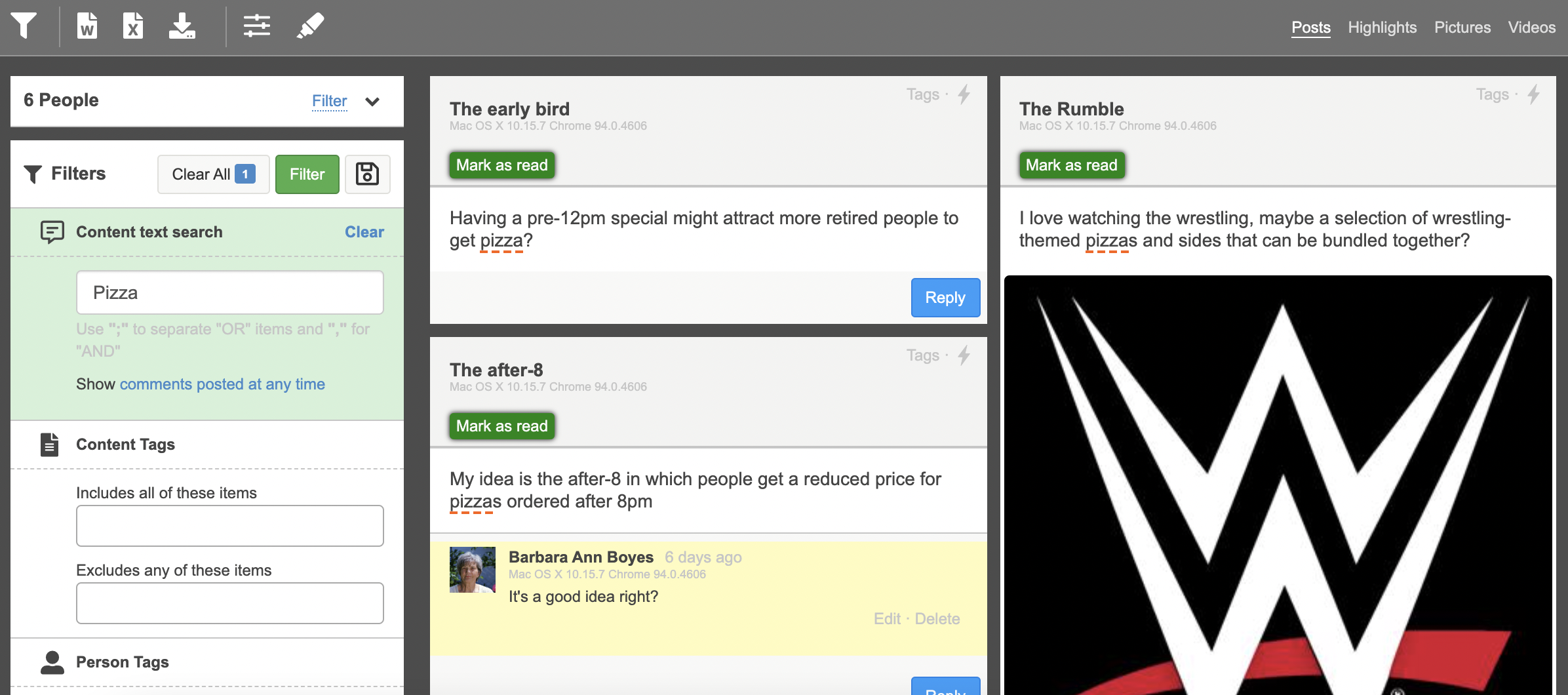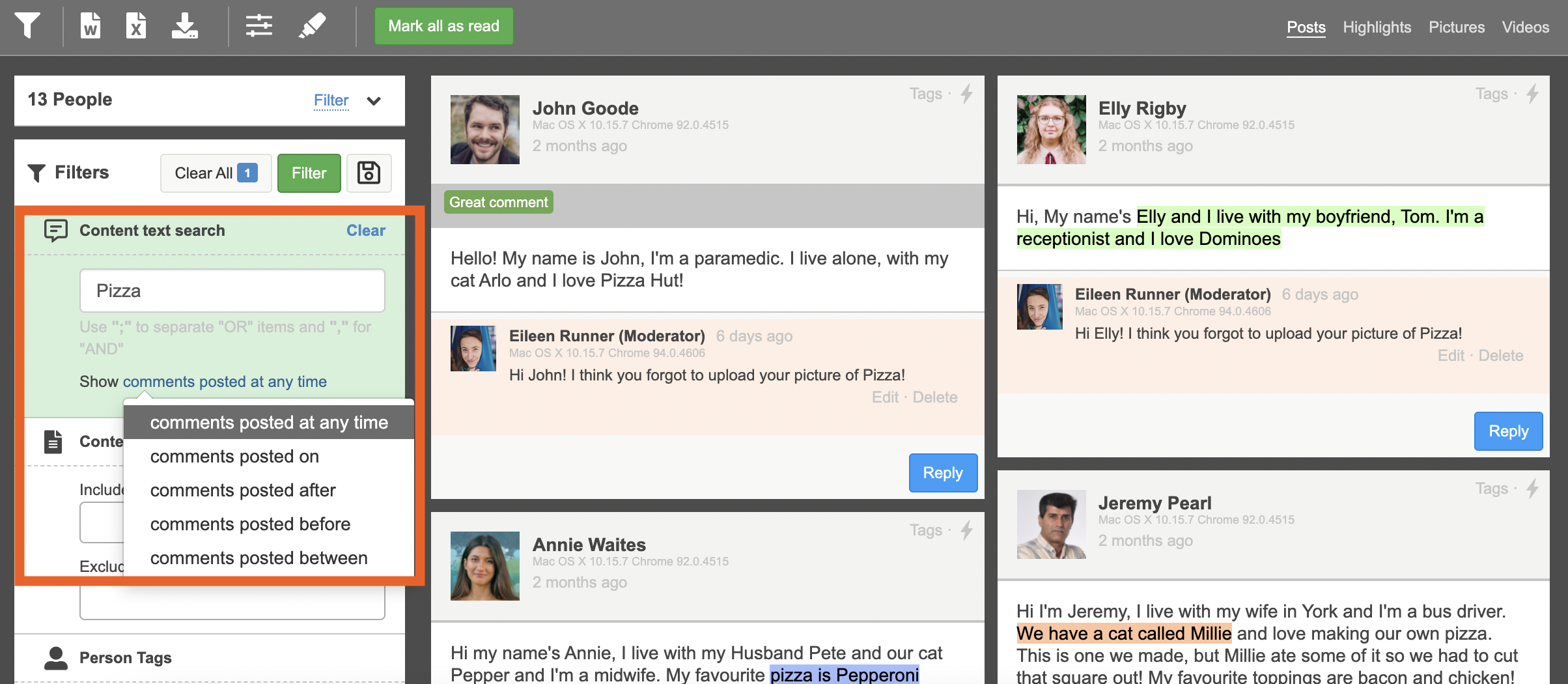 You can use the content text search function to search for keywords in participants posts to pull out the information you need and to help gain further insights.