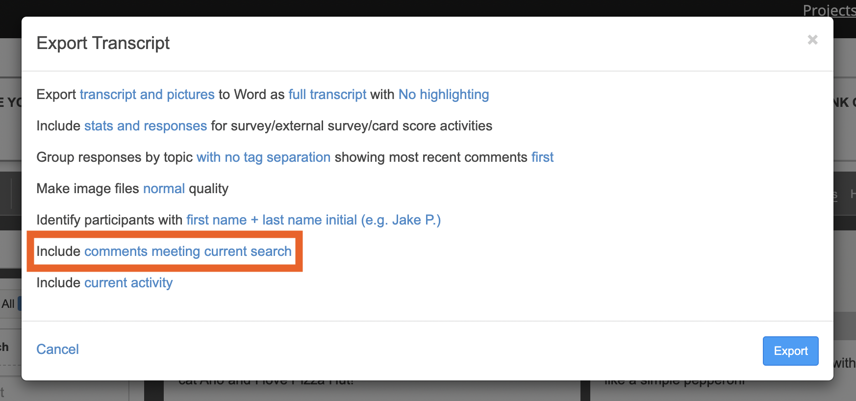 Before you select the blue 'export' button make sure the second to last setting reads 'include comments that meet current search' and change any other settings to finalise exporting your transcript.