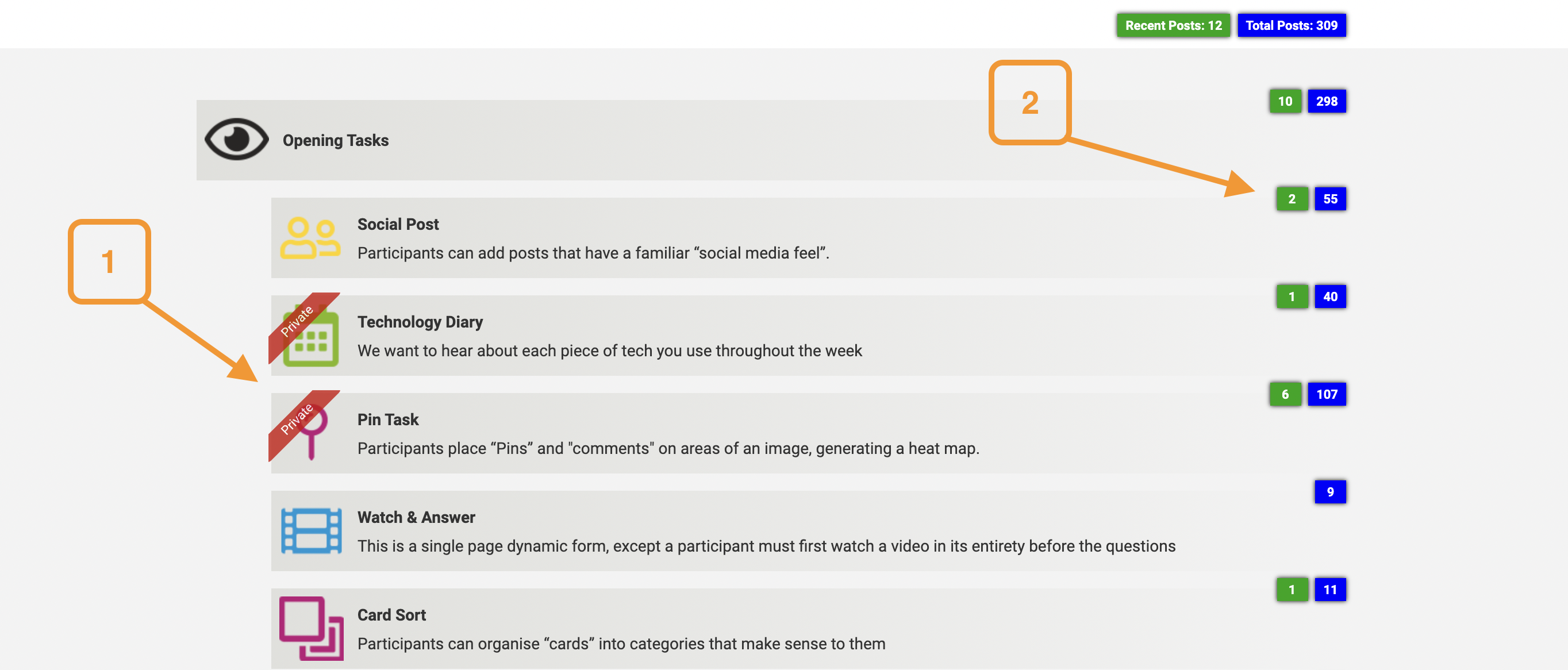 - How many posts are in each activity, and the number of recent posts
