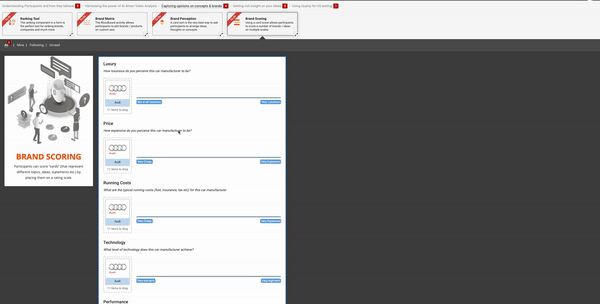 Card Score: Participants can score “cards” (that represent different topics, ideas, statements etc.) by placing them on a rating scale.