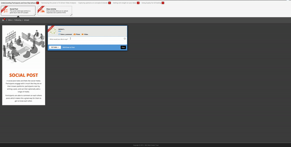 Social Post: Participants can add posts that have a familiar “social media feel”. They can include any amount of text, use emojis, and optionally add images and videos.