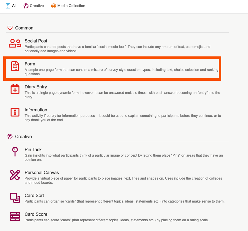 Our form activity, is our swiss army knife of activities. With a multitude of question types, you can utilise this type of activity for any of your projects. Whether you want to collect quant data, ask long form questions or ask participants to rank statements or products you can do it in a form!