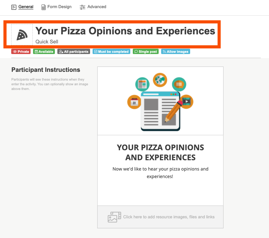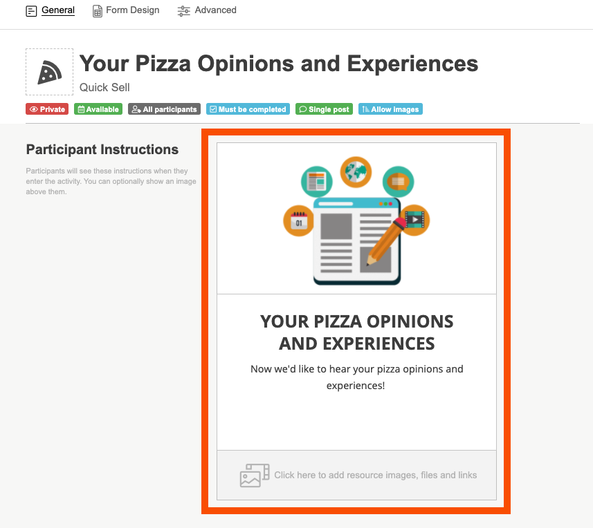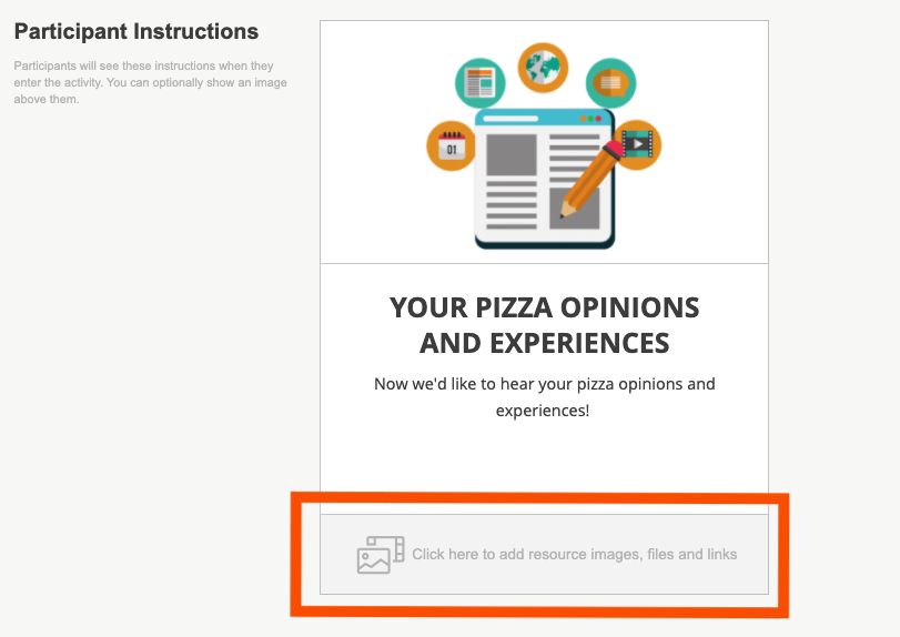 4. You can add in any resource images, videos, or files that a participant may need to complete the activity or use for extra information in the resources section at the bottom of the participant instructions box.