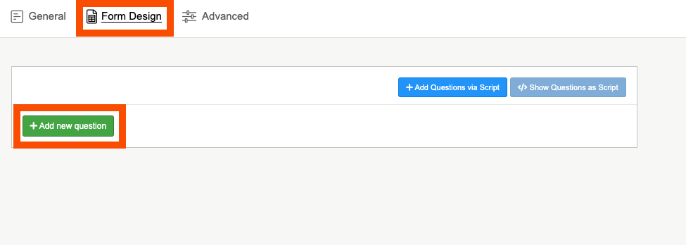 6. Once you are happy with the content, select the 'Form Design' tab to begin uploading your questions. To add a question, click on the green 'Add question' button and choose your question from the available list.