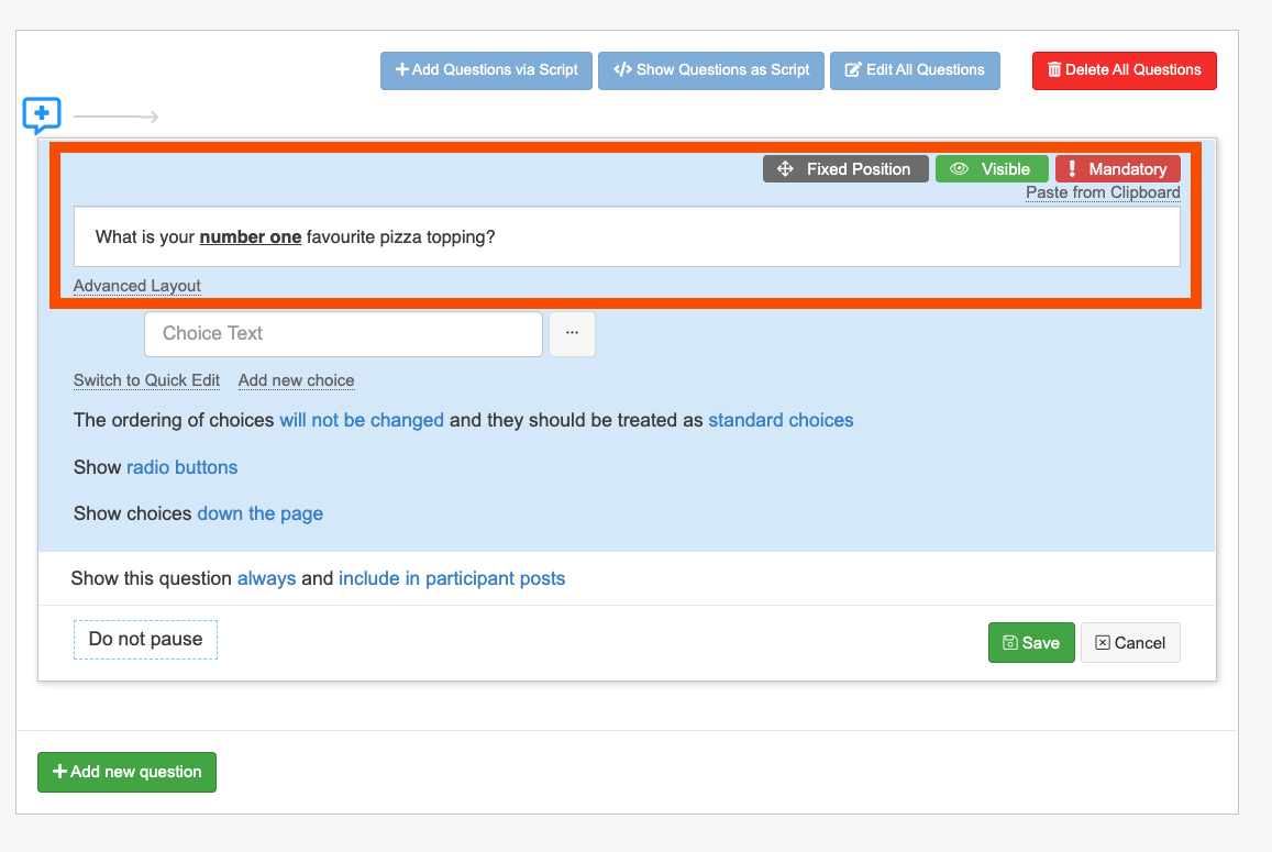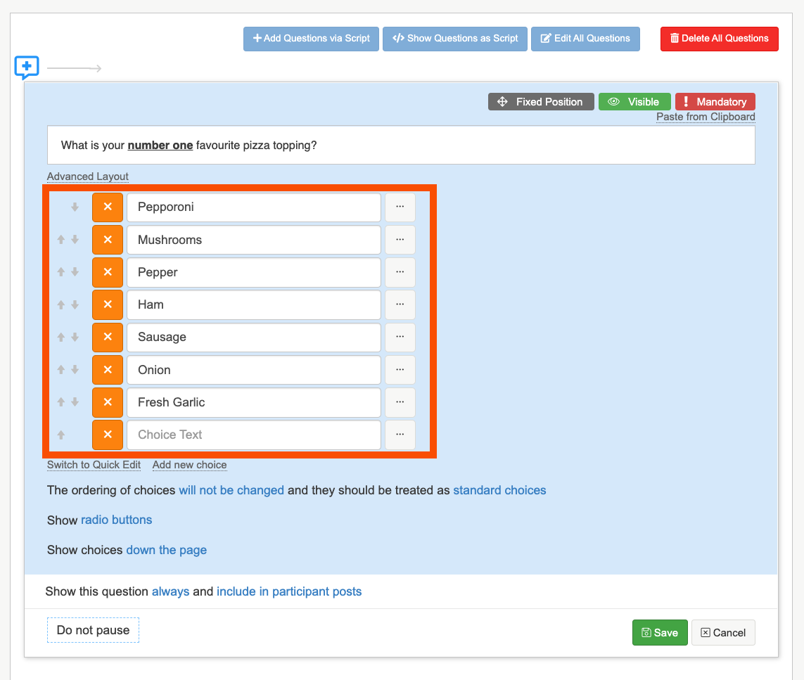 2. Next add in your choices in the Choice text box. You can select 'switch to quick edit' to easily copy and paste in a list of choices.