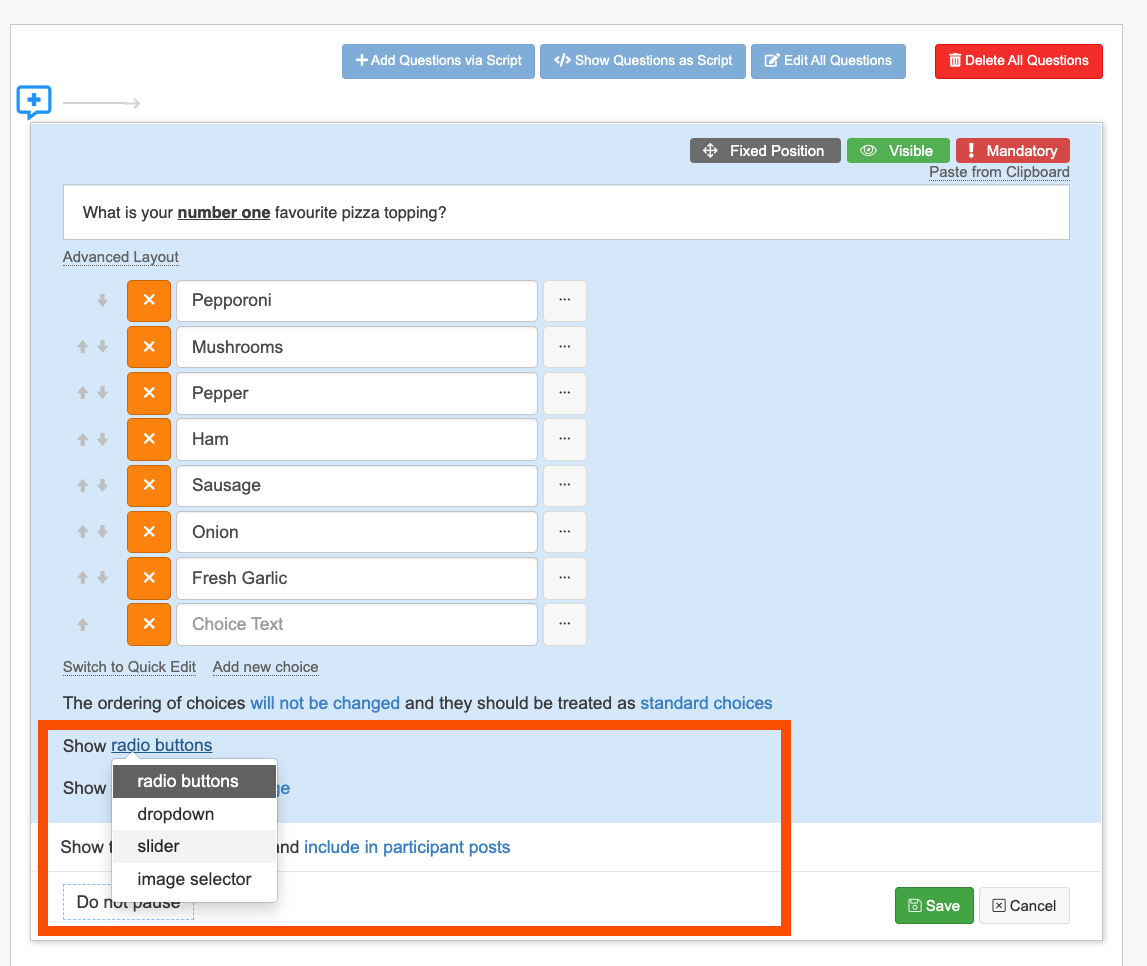 4. You can also choose if you want the choices to as radio buttons, a dropdown menu or slider. If you select slider it will turn your choices into a scale type question and you can choose if you want to show all of the values, or a select few. If you select radio button, you can choose whether or not to have your choices down the page or across the page.