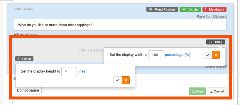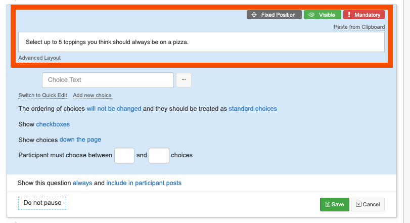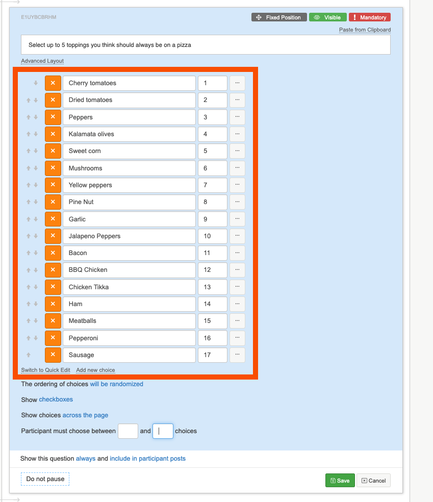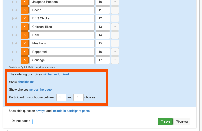 4. Next select if you would like the choices to be across the page or down the page, and how many choices participants can make. Here we are asking them to choose up to 5 toppings, so we will say 'participants must choose between 1 and 5 choices'.