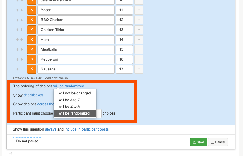 3. Select whether or not you would like the order of the choices to be randomized for each participant.