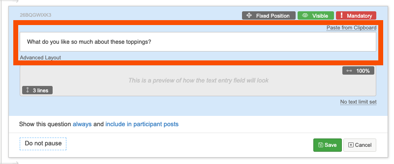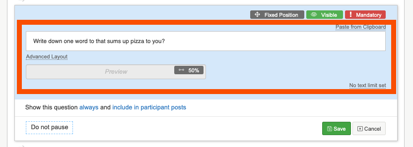 You can use a short text question type to create a question that will allow a participant to enter a short piece of text, generally not more than one line. For example you could be asking them to write down one word that sums up pizza to them.