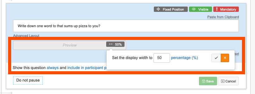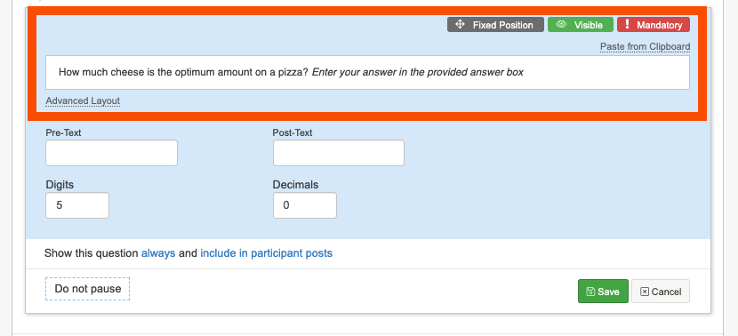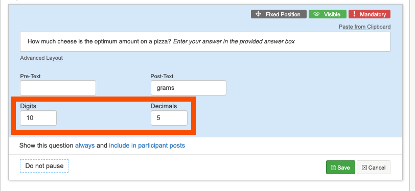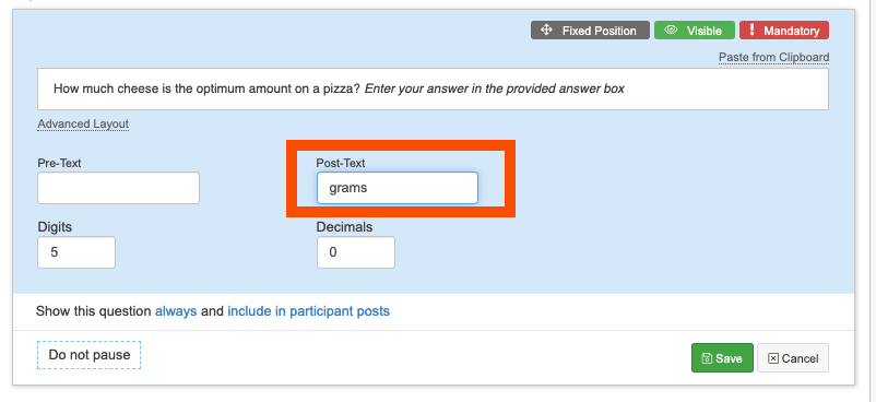 A numeric question type is great for creating a question that will allow a participant to enter their response as a number. You can set Pre-Text and Post-Text in the question settings. For example you might want to ask participants how much cheese in grams in they add to their pizza.