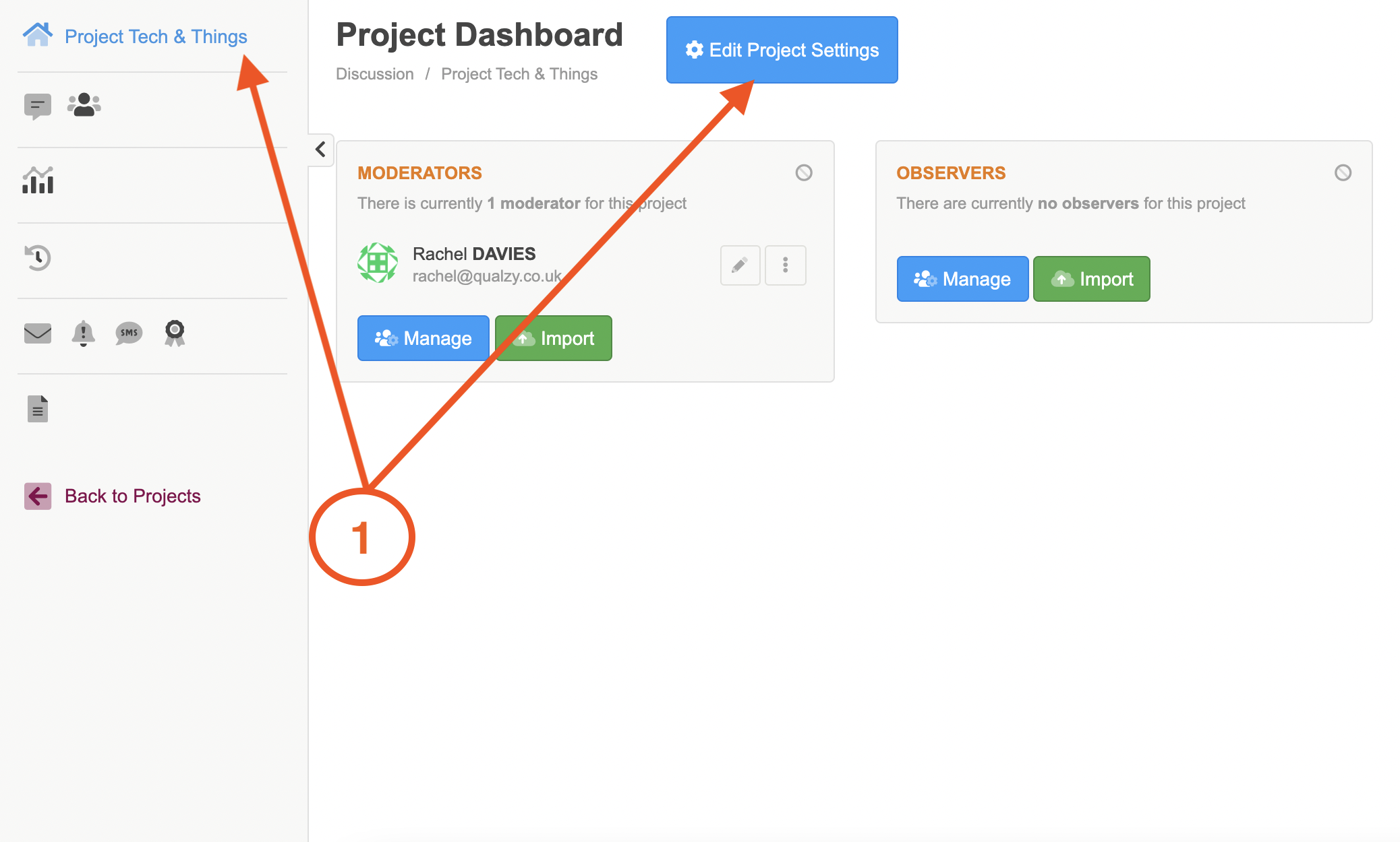 1. You will need to be in the project settings tab to be able to set the notification settings. To get here, click on the home icon or the name of your project on the left hand side menu bar. And then select the blue 'Edit project settings' button.