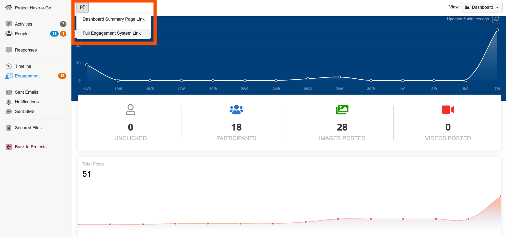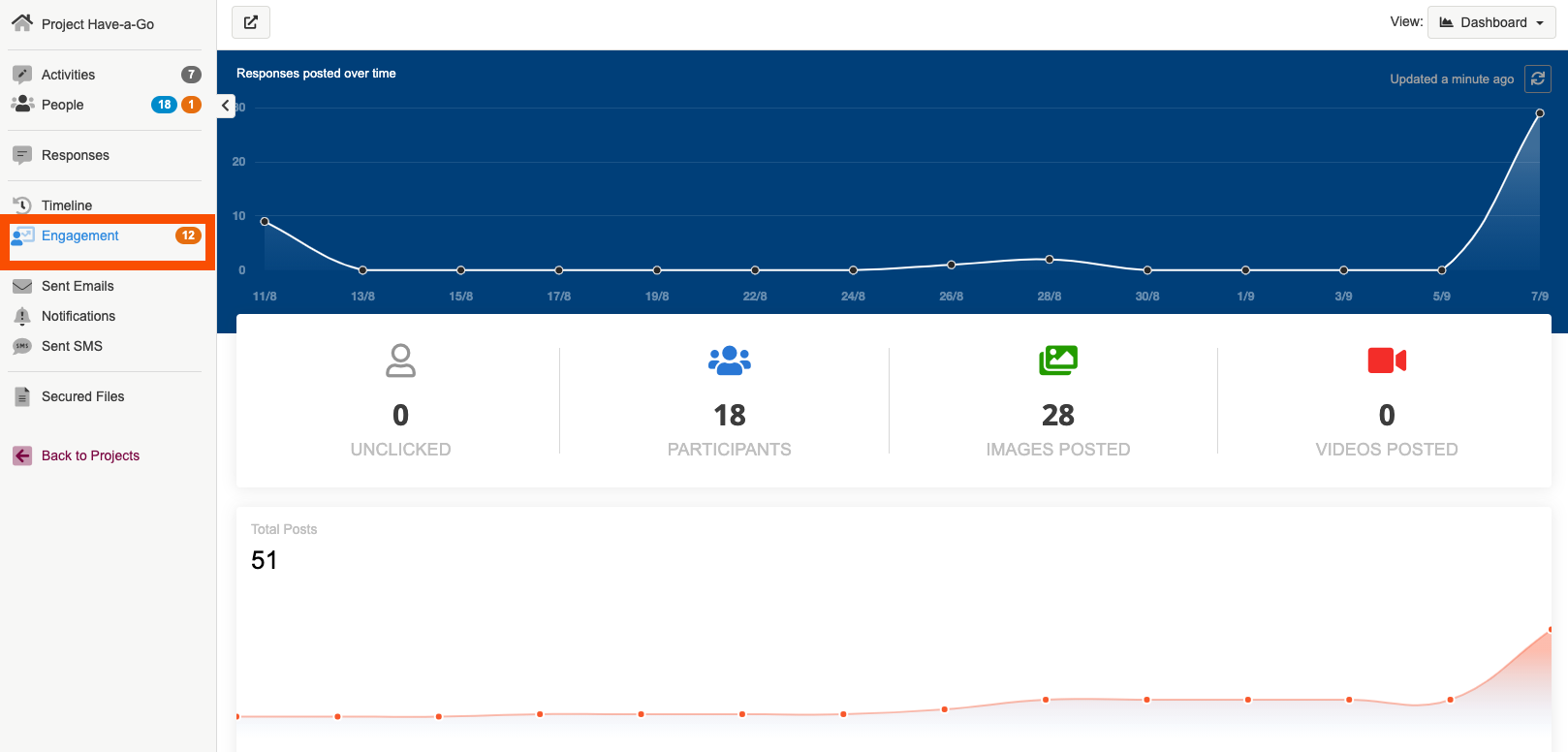 1. The engagement dashboard will only be available once the project has been made live. To navigate there select the 'engagement' icon on the left hand side menu bar.