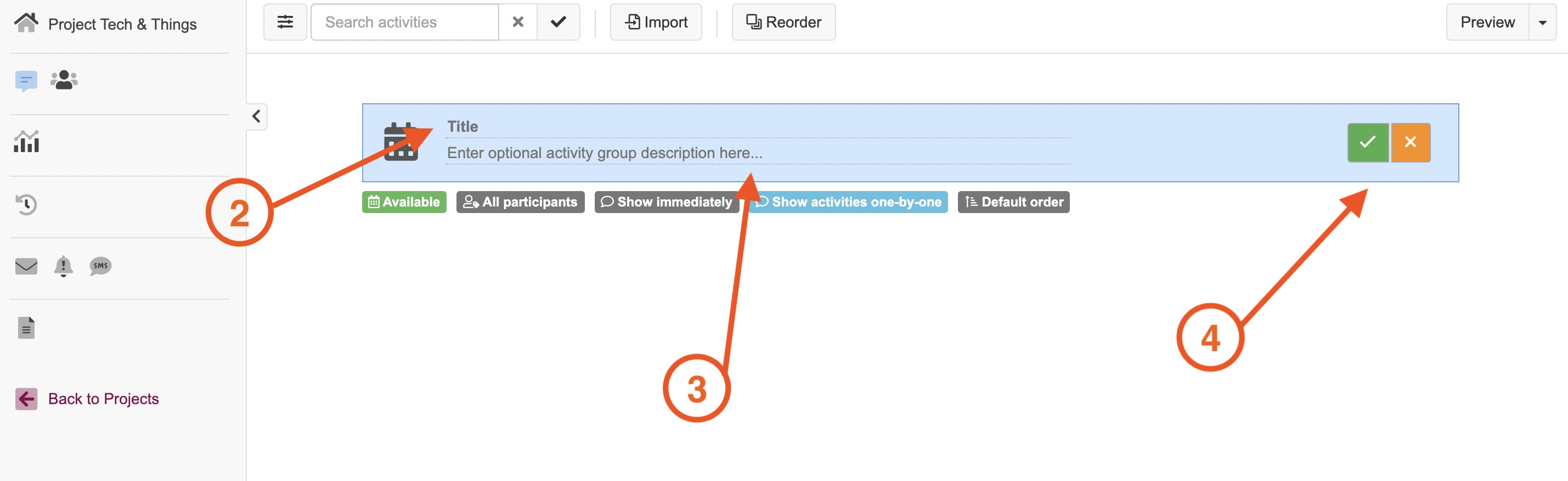 Once you have set up your project introduction, the next step will be to start inputting your activities. If you project spans a few days or has multiple activities you may want to separate your activities into groups. This can be by day, or by theme.