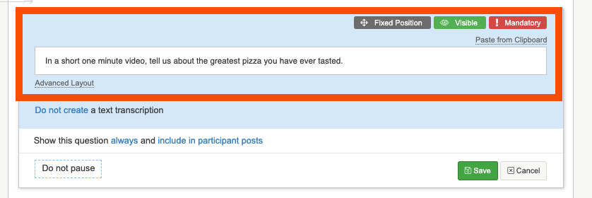 4. After you have added in your question content and changed your settings so they are relevant to your question, click on the green 'save' button to finalise creating your Video Upload question.