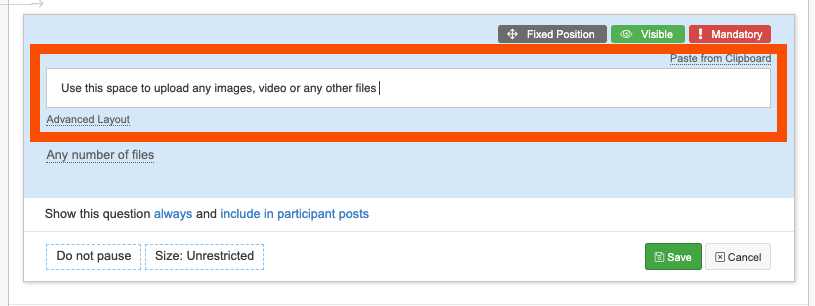 1. Firstly select '"Files Upload' from the question list, it will appear under the Media Uploads section. Then enter in some information about kind of files you would like participants to upload in the question text box.