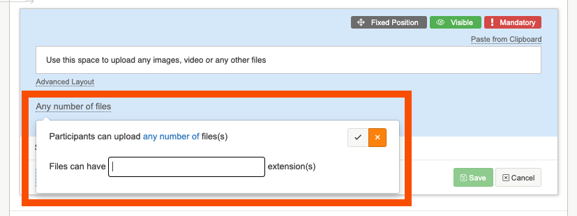 2. You can select how many files and what file types participants can upload. When you click into the white file extension box, a drop-down list of all the different file types will appear. You can use this to select the relevant file extensions.