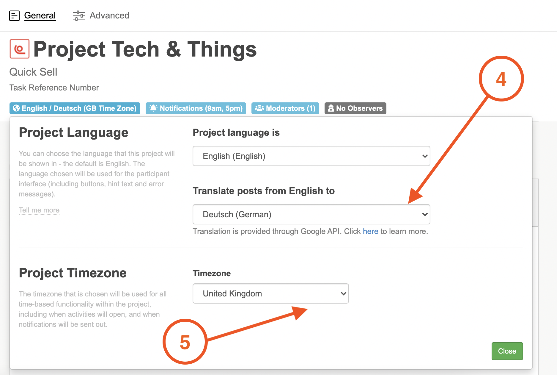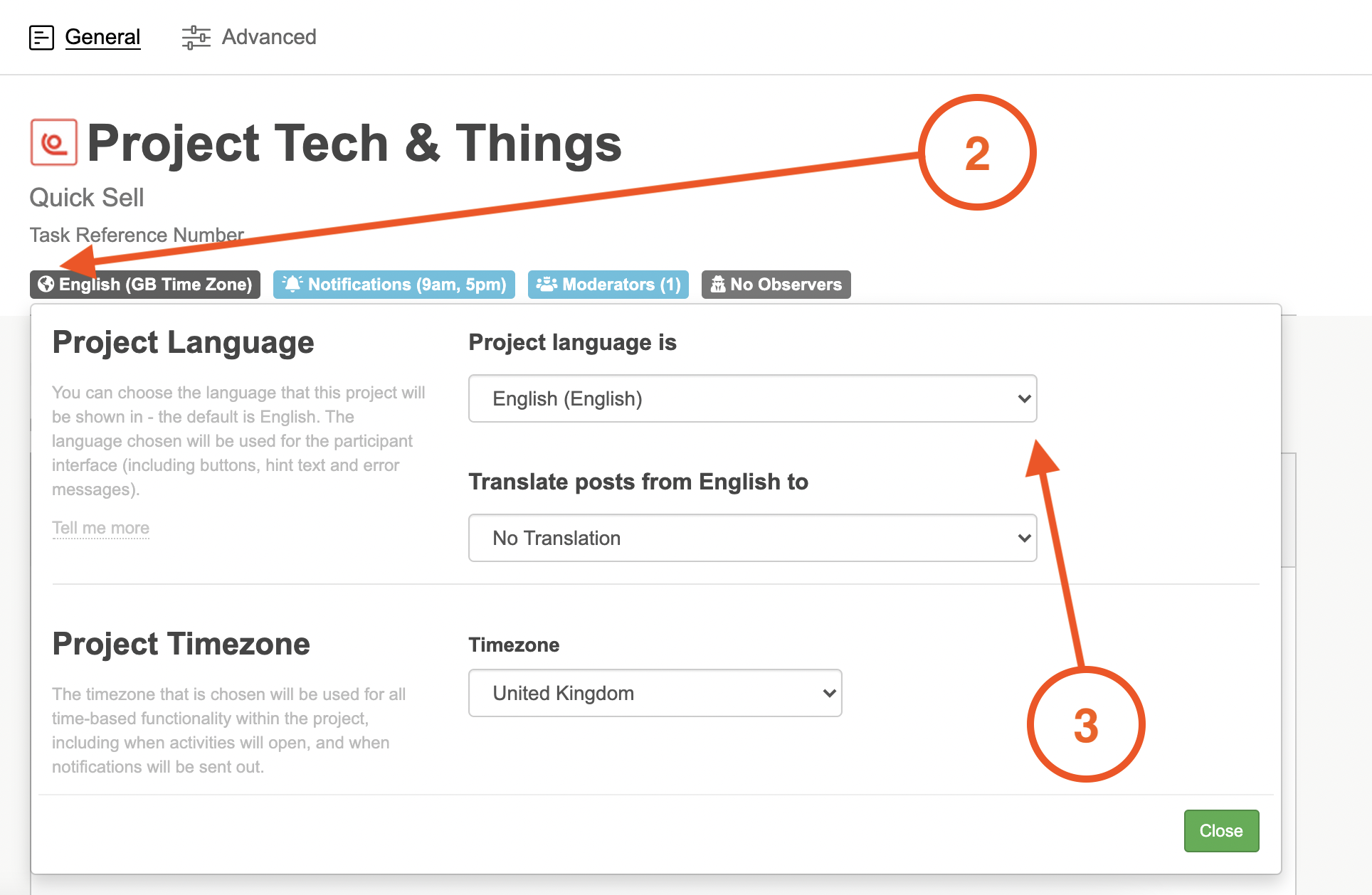 How to change the language of your project, choose which language to translate posts into and update the timezone of the project.