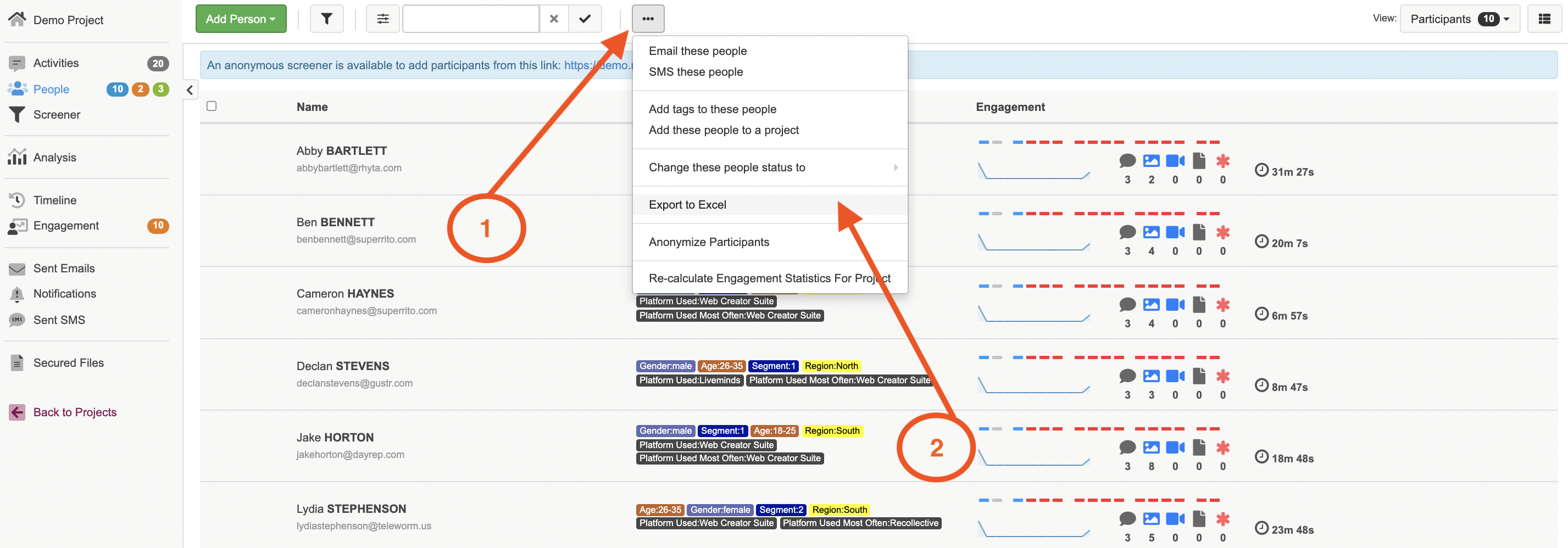 At the end of your project, or even during your project you may want to a document with all of the handy statistics including T&C's acceptance, engagement and activity completion. You can get this data by exporting an excel document in the people browse.
