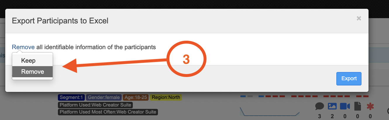 3. Selecting 'Export to Excel' will bring up a little pop-up box where you can choose whether or not to keep or remove identifiable information in the excel sheet.
