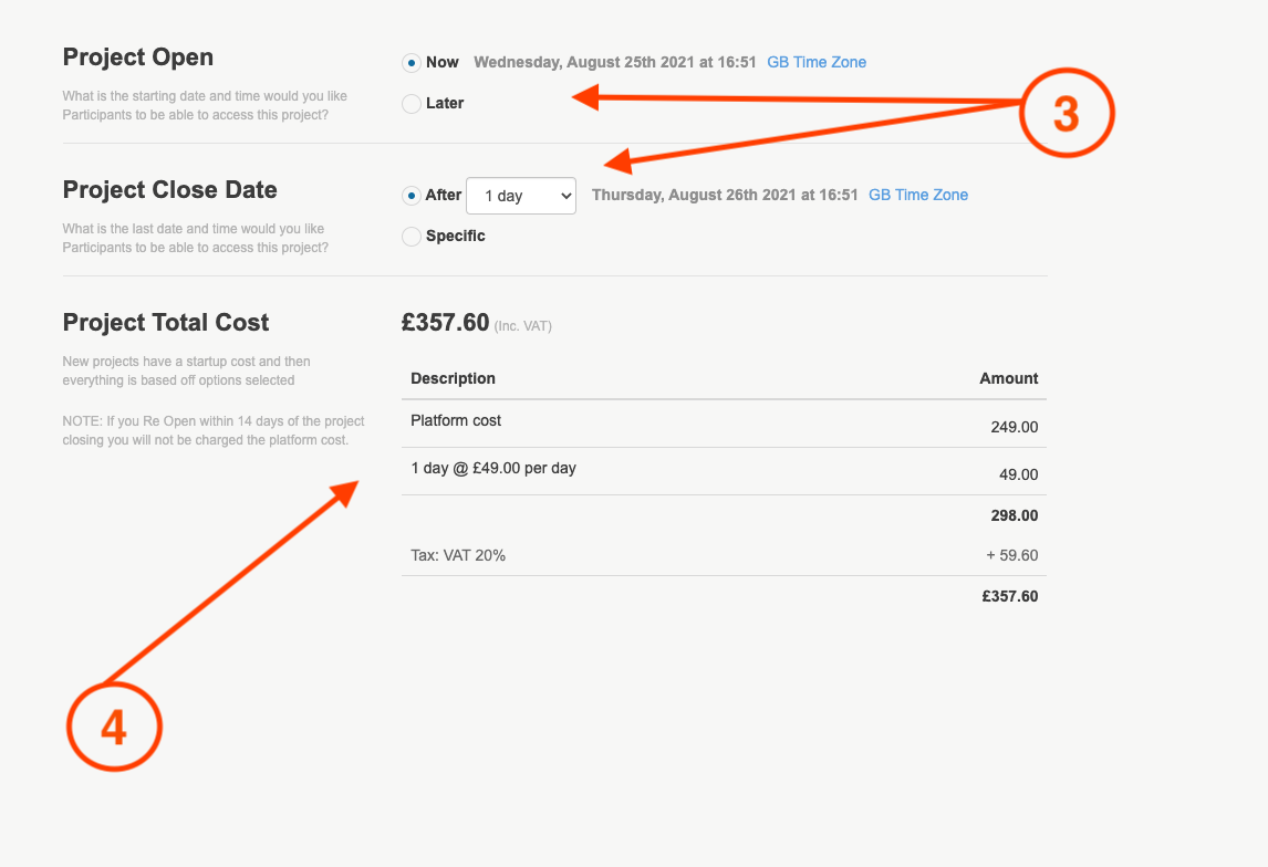 Set the duration of the project, either by using our handy drop down menu to select how many days you would like the project to run for, or by selecting a specific date.