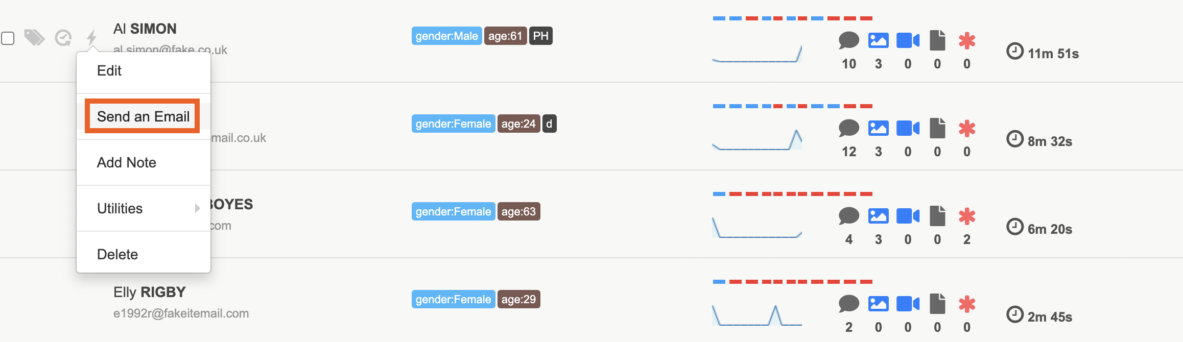 1. In the people browse you can find the person you’d like to email, and click the lightning bolt that appears when you hover over their name, this will bring up the action menu.