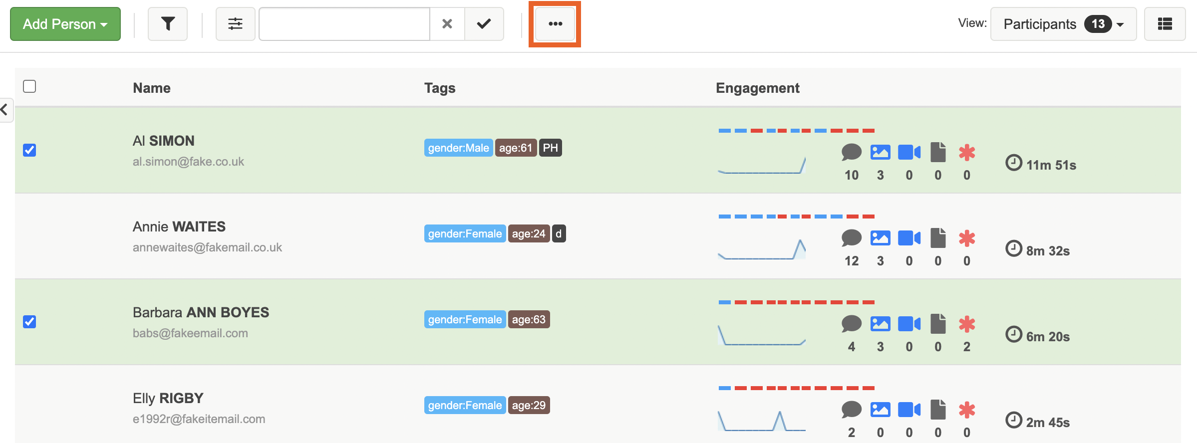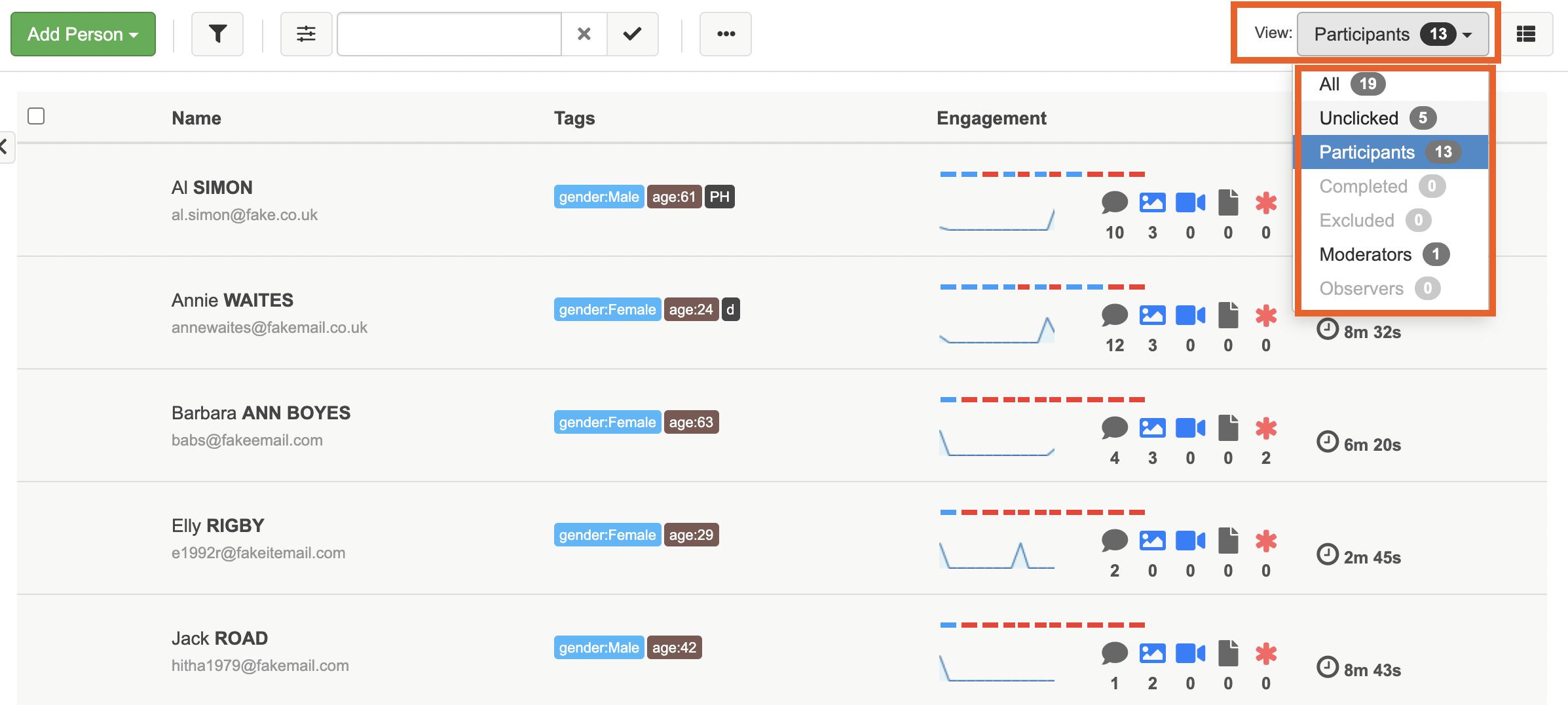 1. First choose the group you’d like to email, this can unclicked, participants, moderators or observers. Then in the people browse you can change your view to show the group of people you’d like to email.