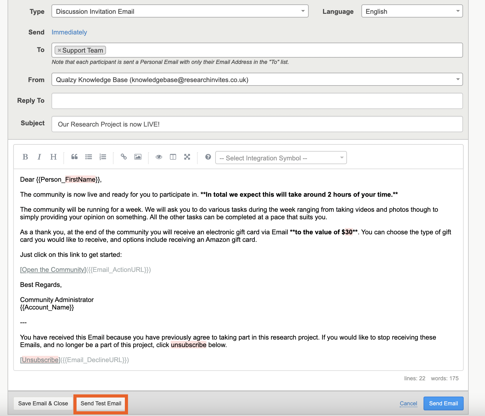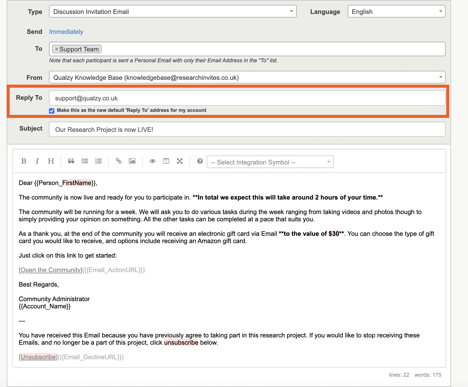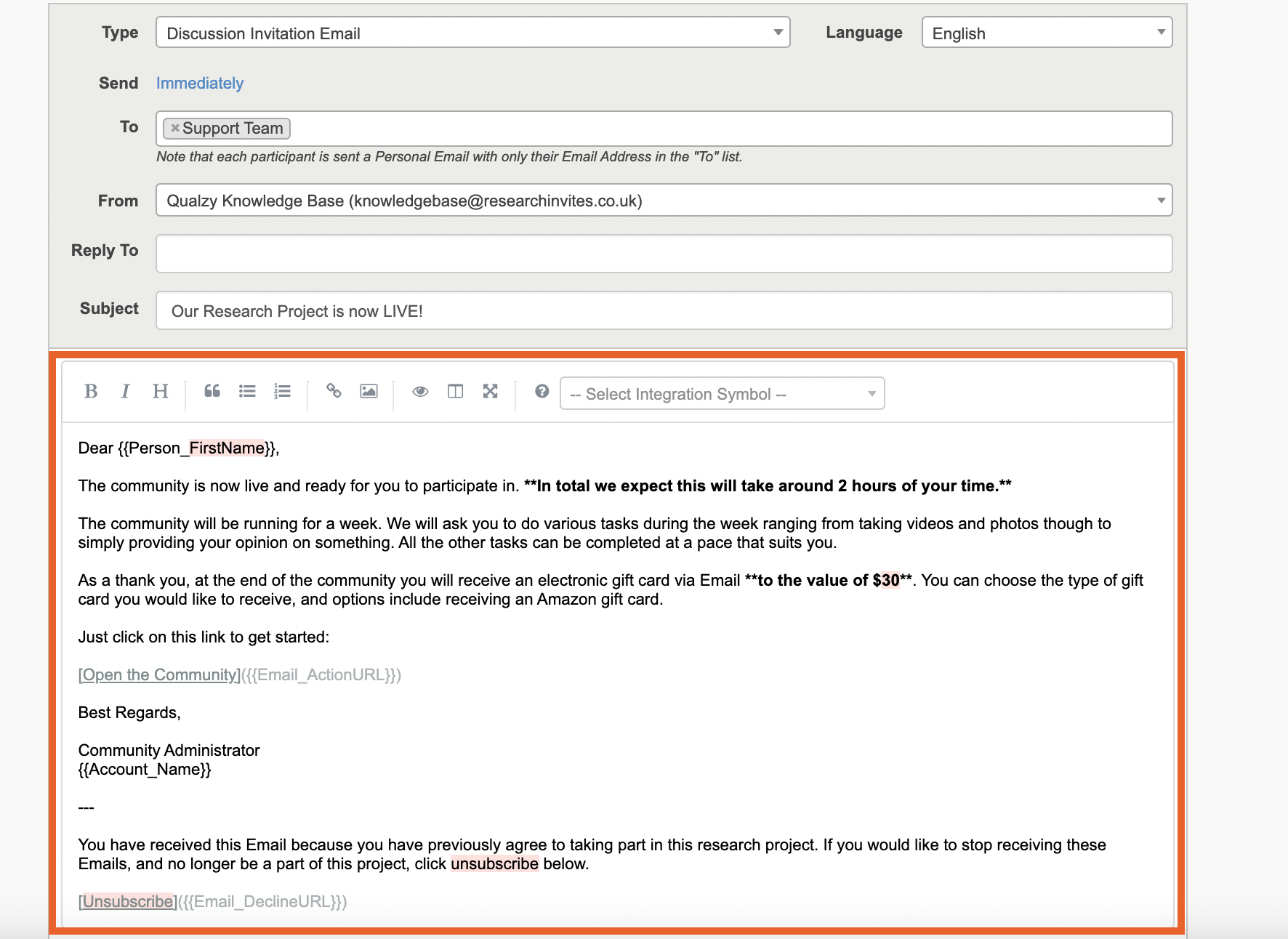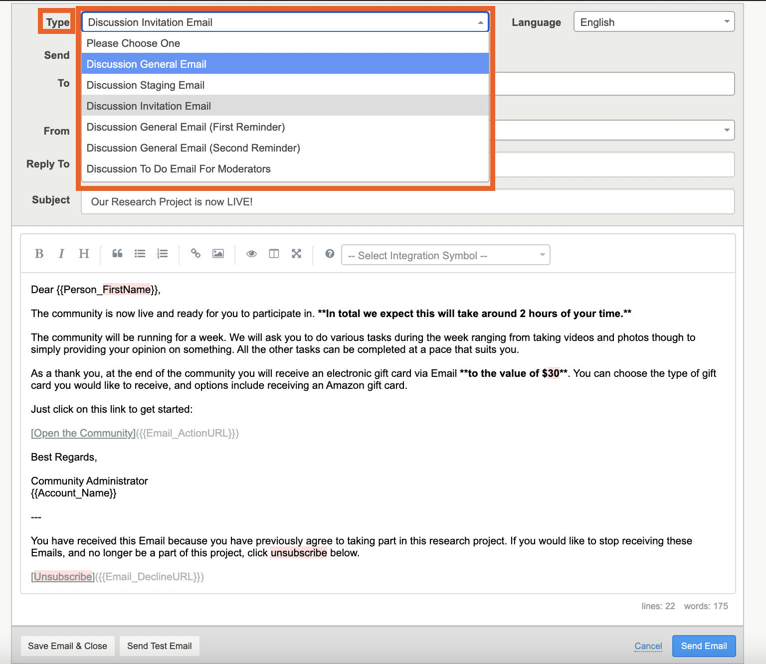 2. You can change the type of email you are sending out by selecting the template from the drop down menu. For example if you are sending out invitation links you will want to use the 'Discussion Invitation Email' template but if you are sending out a general email you can use the 'Discussion General Email' template.