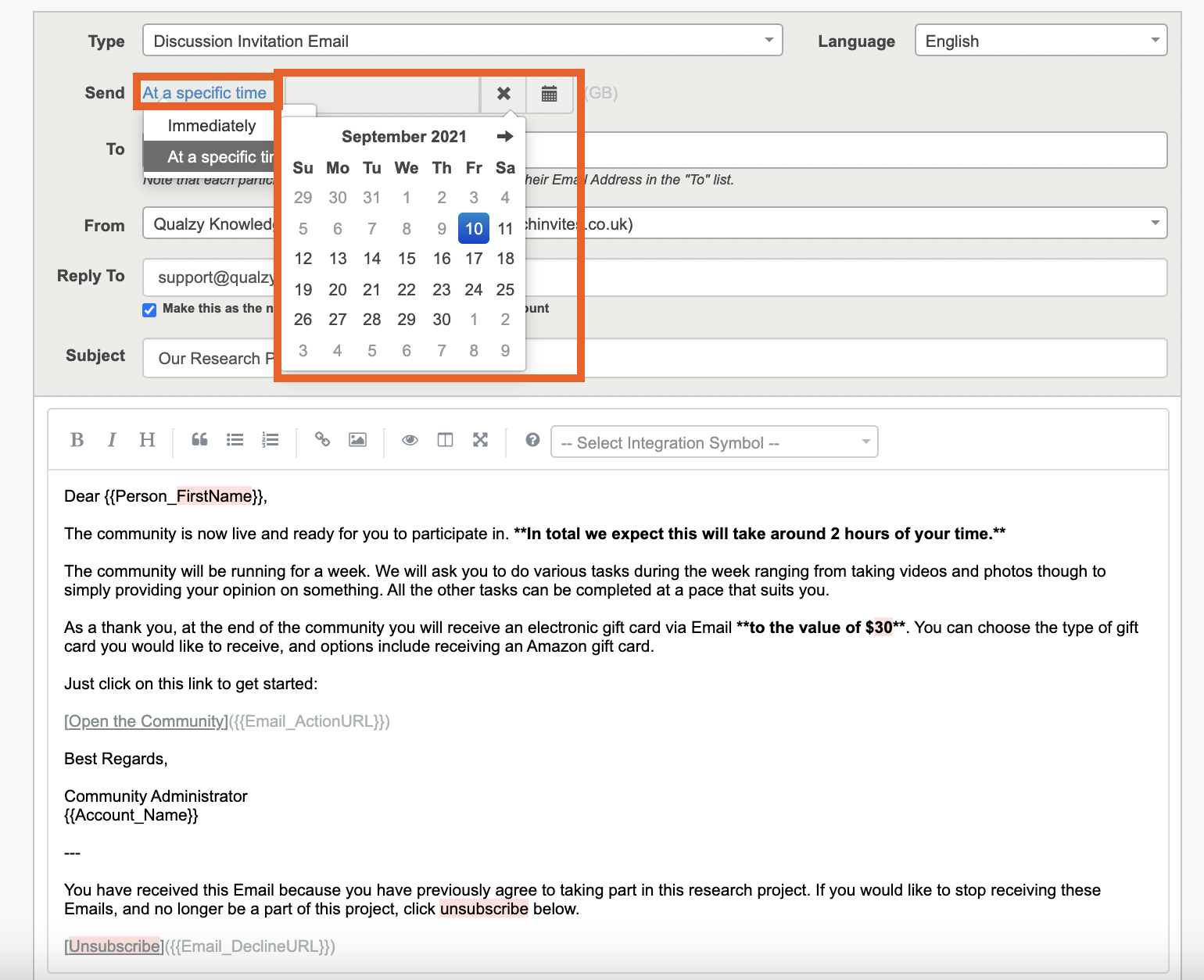 1. If your project is already open, or you haven’t scheduled it to open, the default is to send your email immediately. You can change this by clicking “immediately” and selecting a time and date. This will be set to the project’s set local time.