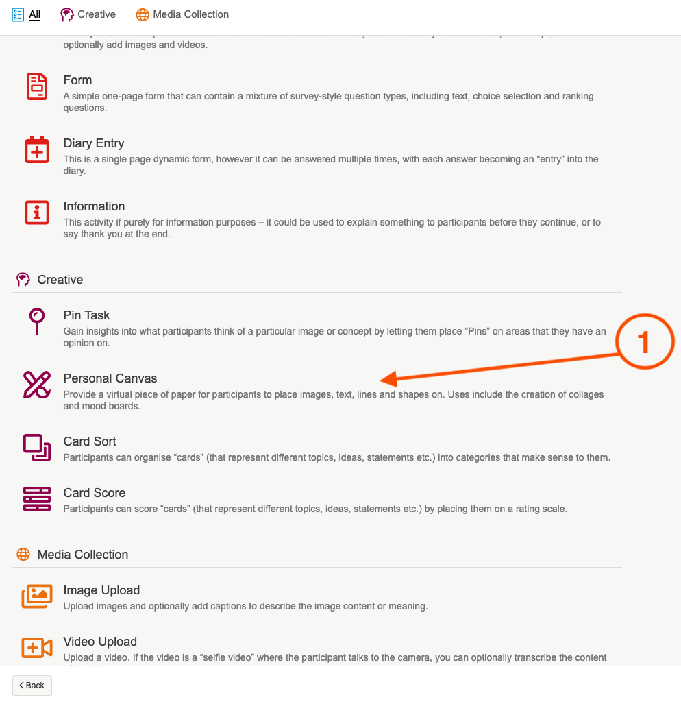 1. Select 'Personal Canvas' from the list of activities that appear after you have selected 'add new activity' in the activity edit screen.