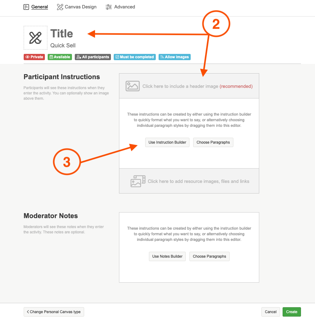 2. Give your activity a title, and an optional quick sell. A quick sell can be used to give a little bit of information about the activity, or to let a participant know they have a certain amount of time to complete it.