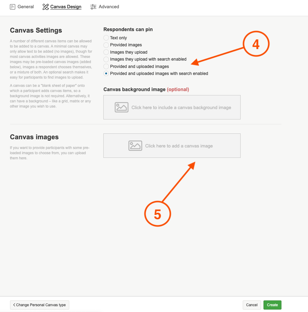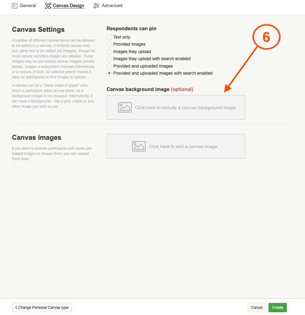 6. A canvas is a 'blank sheet of paper' onto which a participant adds their images, text, lines and shapes. Therefore a background image is not required, however you can have a background like a grid or matrix (excellent for brand mapping) or an image you wish to use.