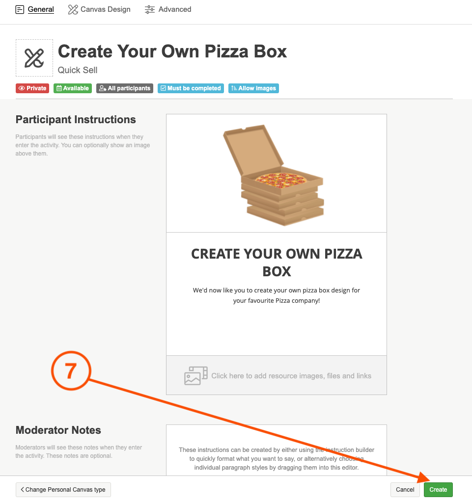7. Once you are happy with the content, and canvas images you have uploaded you can click on the green create button to finalise the set up of your 'Personal Canvas' activity.