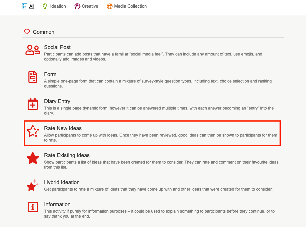 NOTE: There are three types of ideation activity. This article explores how to set up a Rate New Ideas activity. To learn how to set up the other types visit these pages: