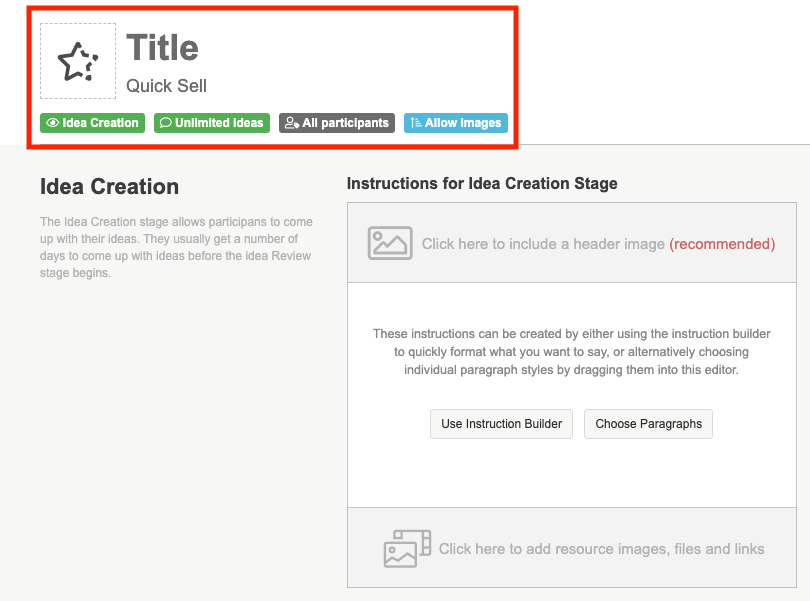 3. Use the Idea Creation Stage instruction builder, to enter in the activity information and instructions to the participants, so they know the subject you'd like them to base their ideas on. It's a good idea to include time scales so participants know how long they have to create ideas.