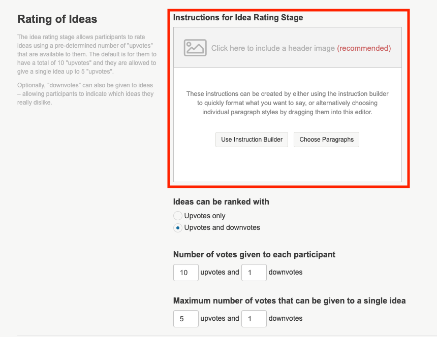 4. Below the Idea Creation Stage instruction builder, use the Idea Rating Stage instruction builder to give information on how the Rating Stage of the activity works.