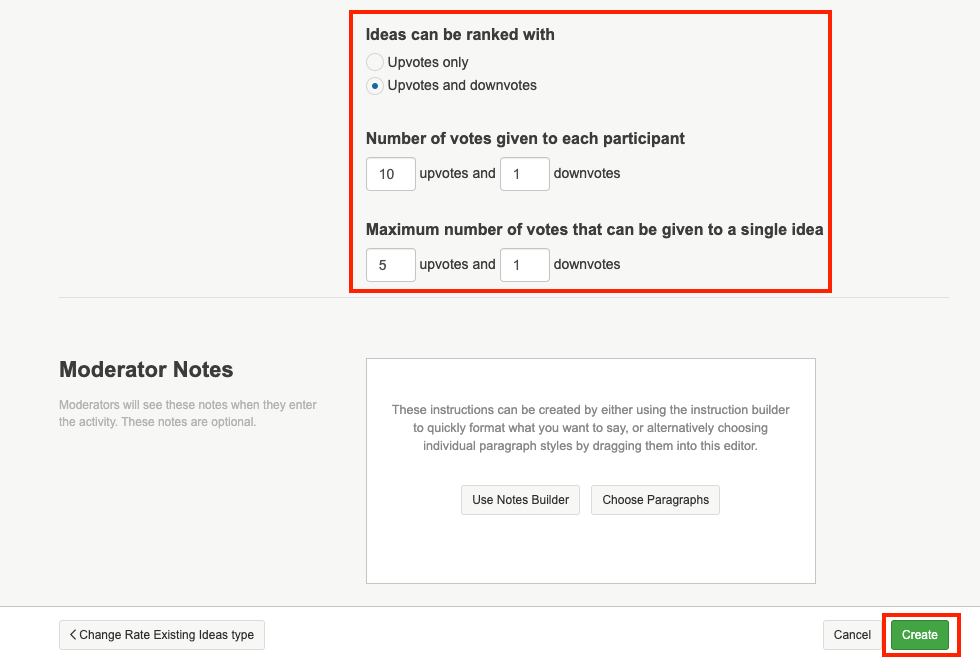 5. You can then set up whether ideas can be rated with upvotes only or upvotes and downvotes, before pressing the green "create" button.