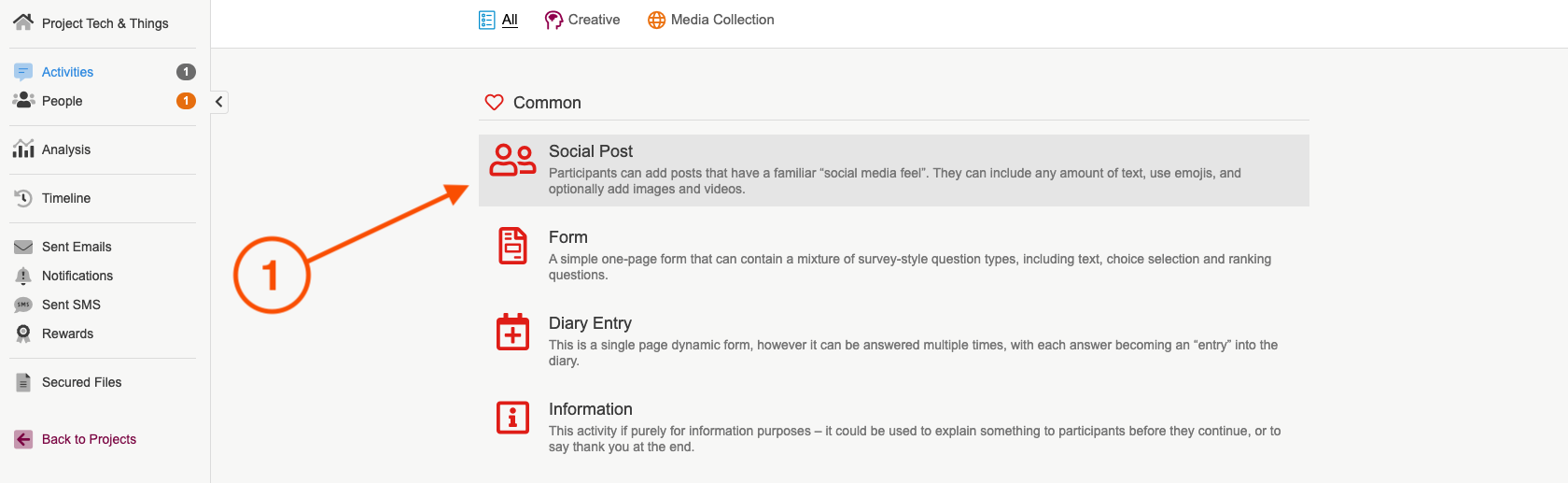 1. Select Social Post activity from the list of activities that appear after you have selected 'add new activity' in the activity edit screen.