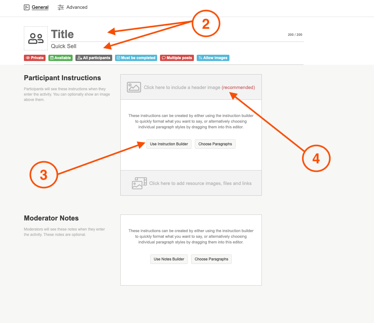 2. Give your activity a title, and an optional quick sell. A quick sell can be used to give a little bit of information about the activity, or to let a participant know they have a certain amount of time to complete it.