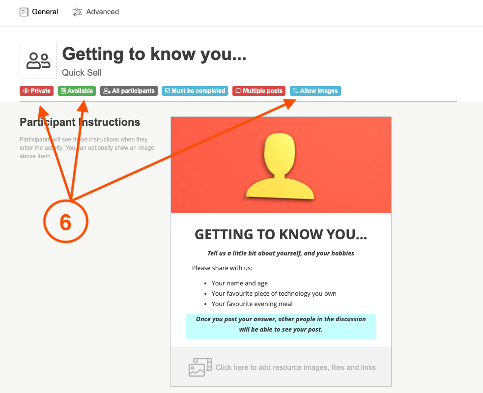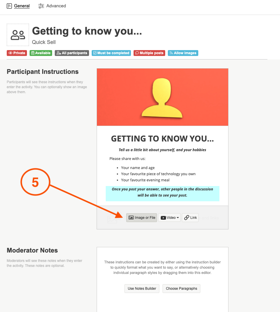 5. You can add in any resource images, videos, or files that a participant may need to complete the activity or use for extra information in the resources section at the bottom of the participant instructions box.