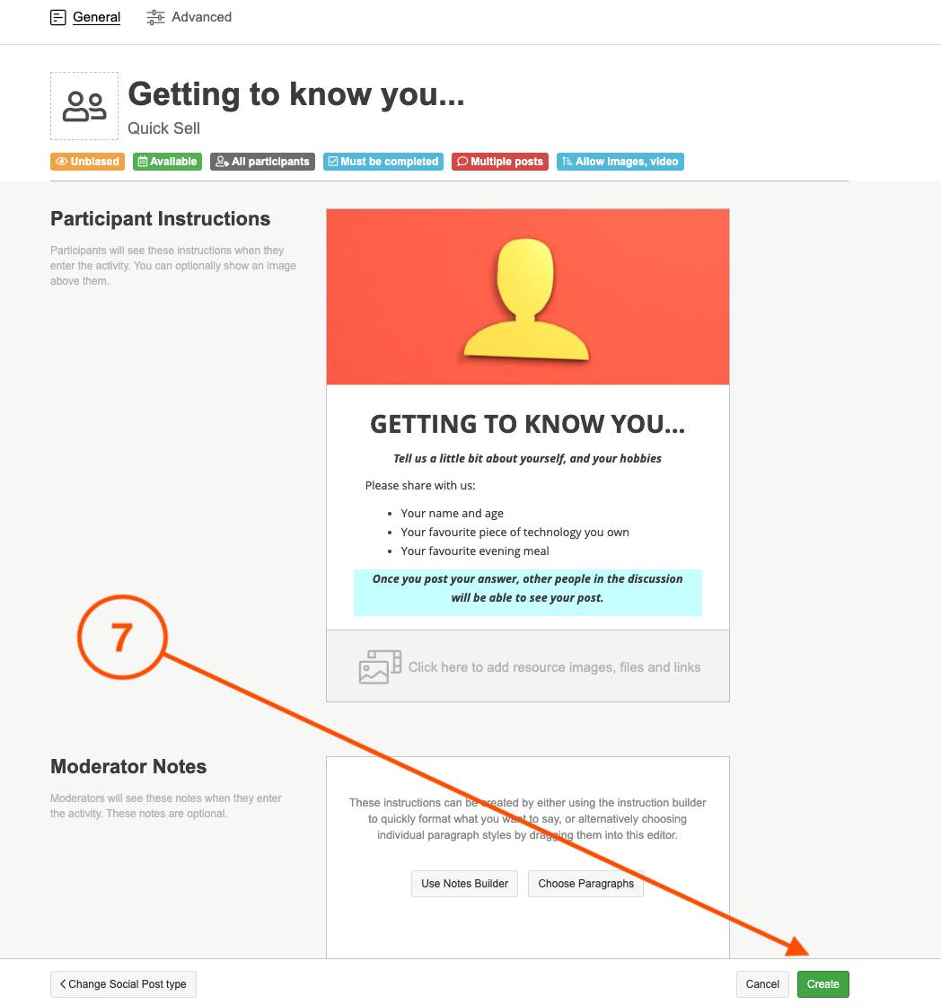 7. Once you are happy with the content, design and settings hit the green create button to finalise creating your activity.