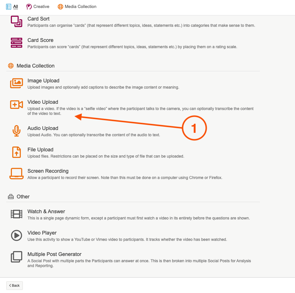 1. Select Video Upload activity from the list of activities that appear after you have selected 'add new activity' in the activity edit screen.