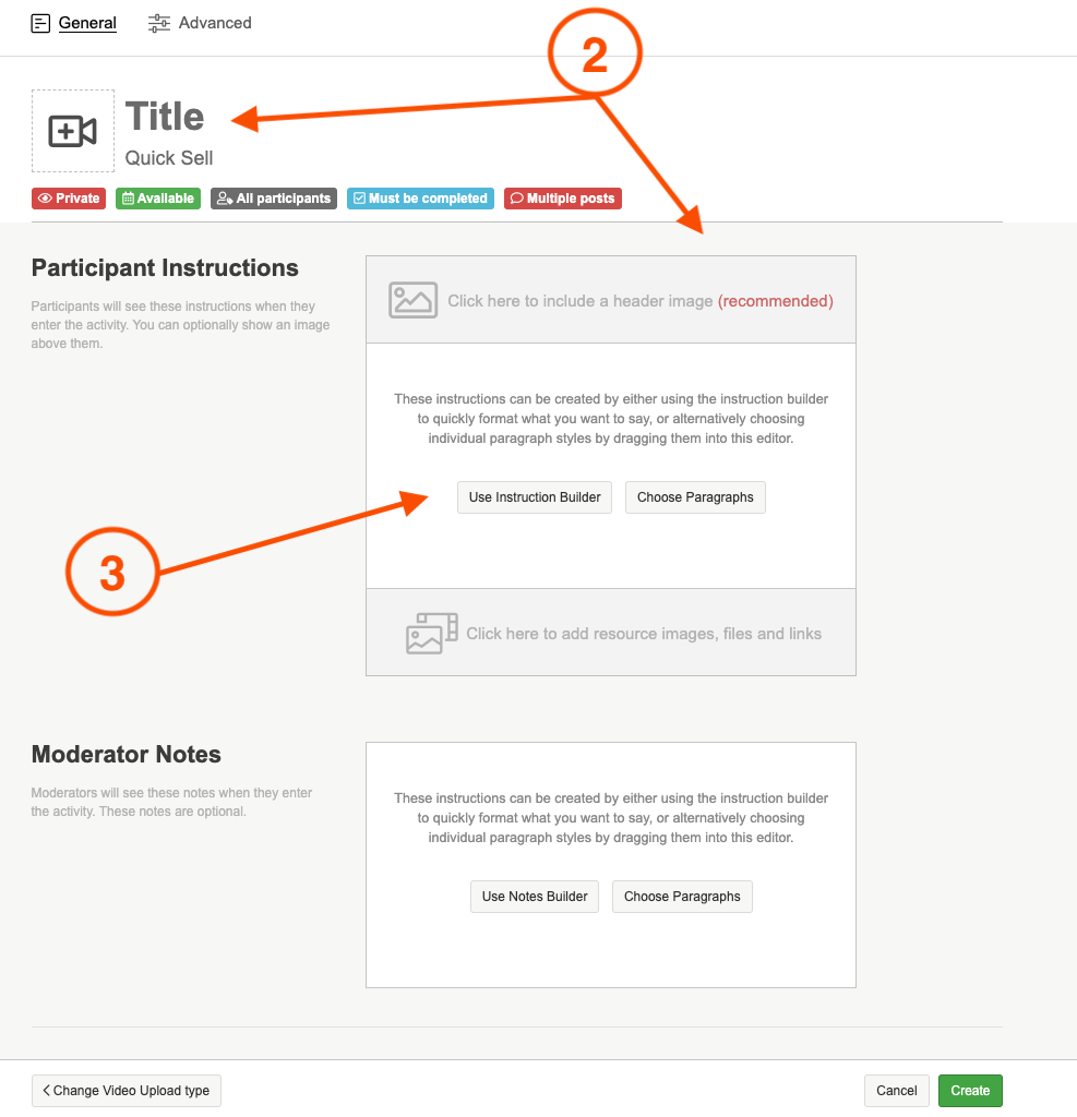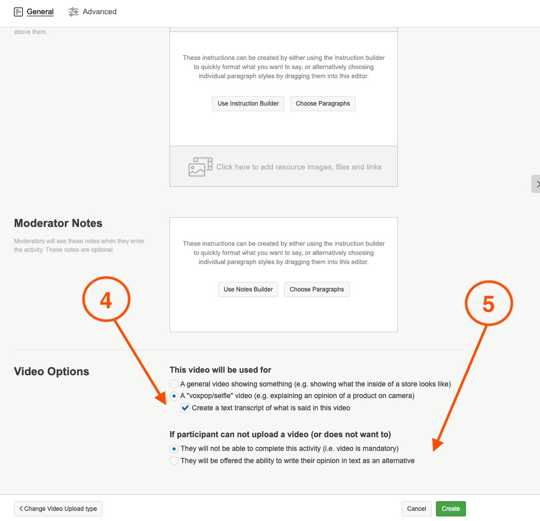 6. Once you are happy with the content, and you have uploaded your moderator notes if needed (this works the same was as participant instructions) click on the green 'create' button to finalise the set up of your Video Upload activity.
