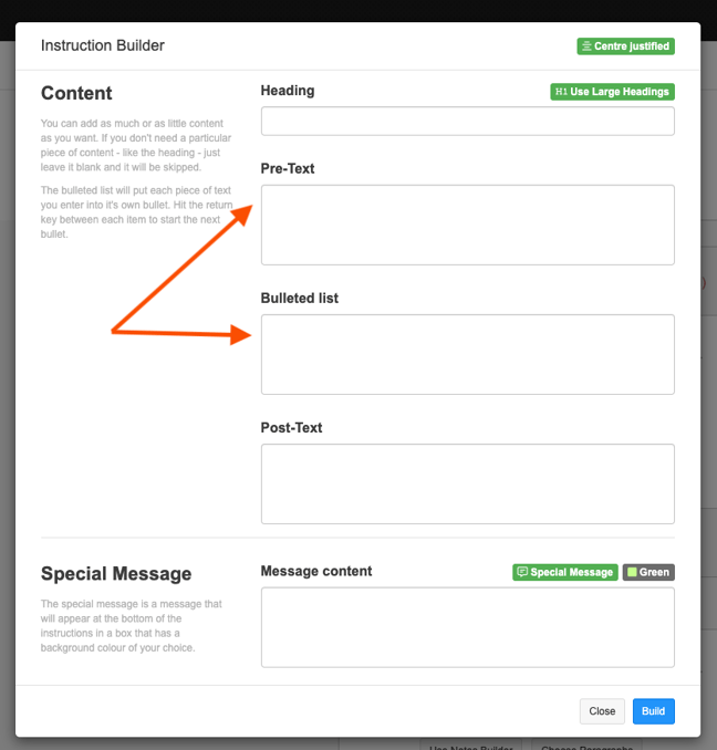 There are a few different blank boxes where you can enter content in the instruction builder, if you do not need to use a particular box then you can leave it blank. The bulleted list will put each piece of text you enter into its own bullet. Hit the return key between each item to start the next bullet.